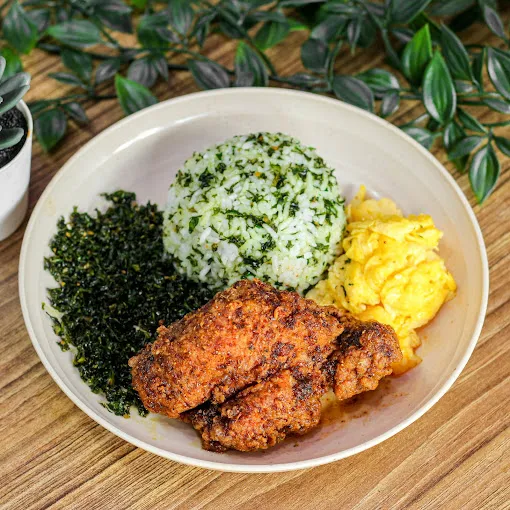 Restoran ini menawarkan ayam pedas yang disajikan dengan nasi dan berbagai pelengkap seperti telur orak-arik serta sayuran crispy.